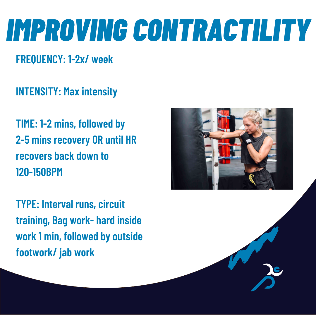 Cardiac contractility refers to how hard the heart beats to push out blood to your muscles. The best way to achieve this is through interval training. This also improve mitochondrial density in the heart.